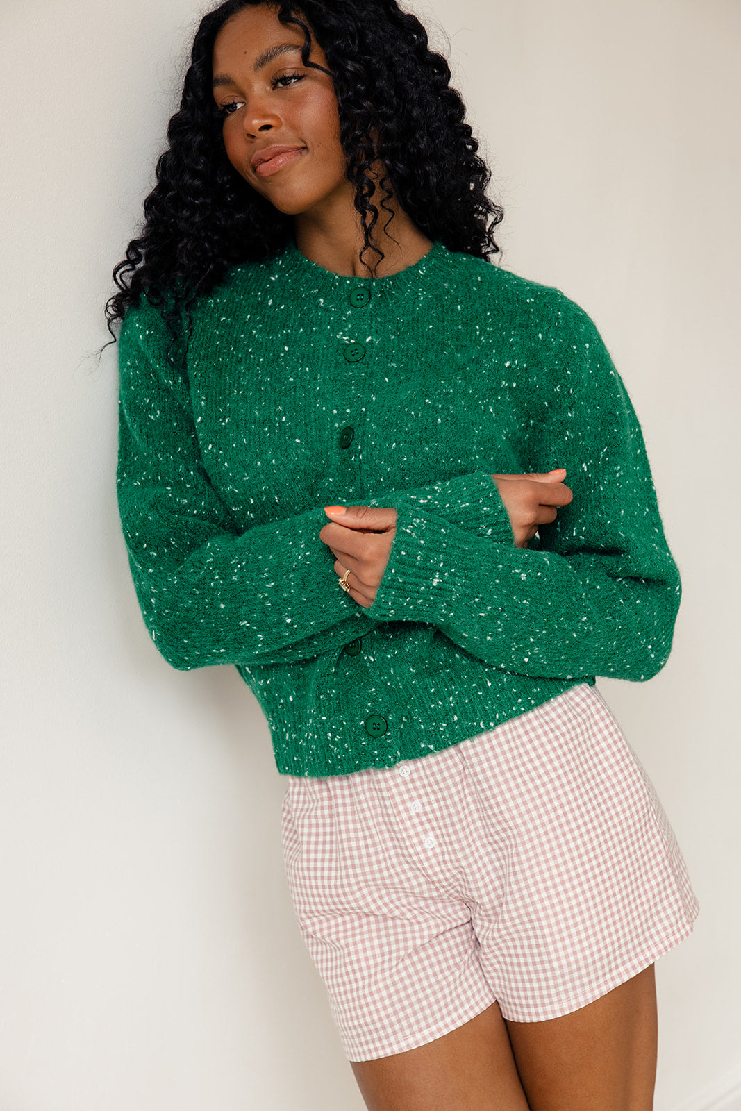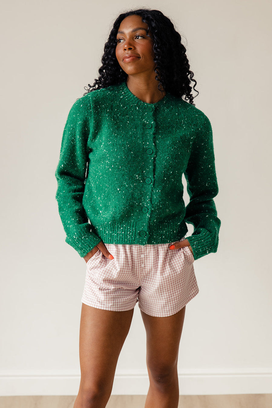 // paired with the defying gravity speckled cardigan in green