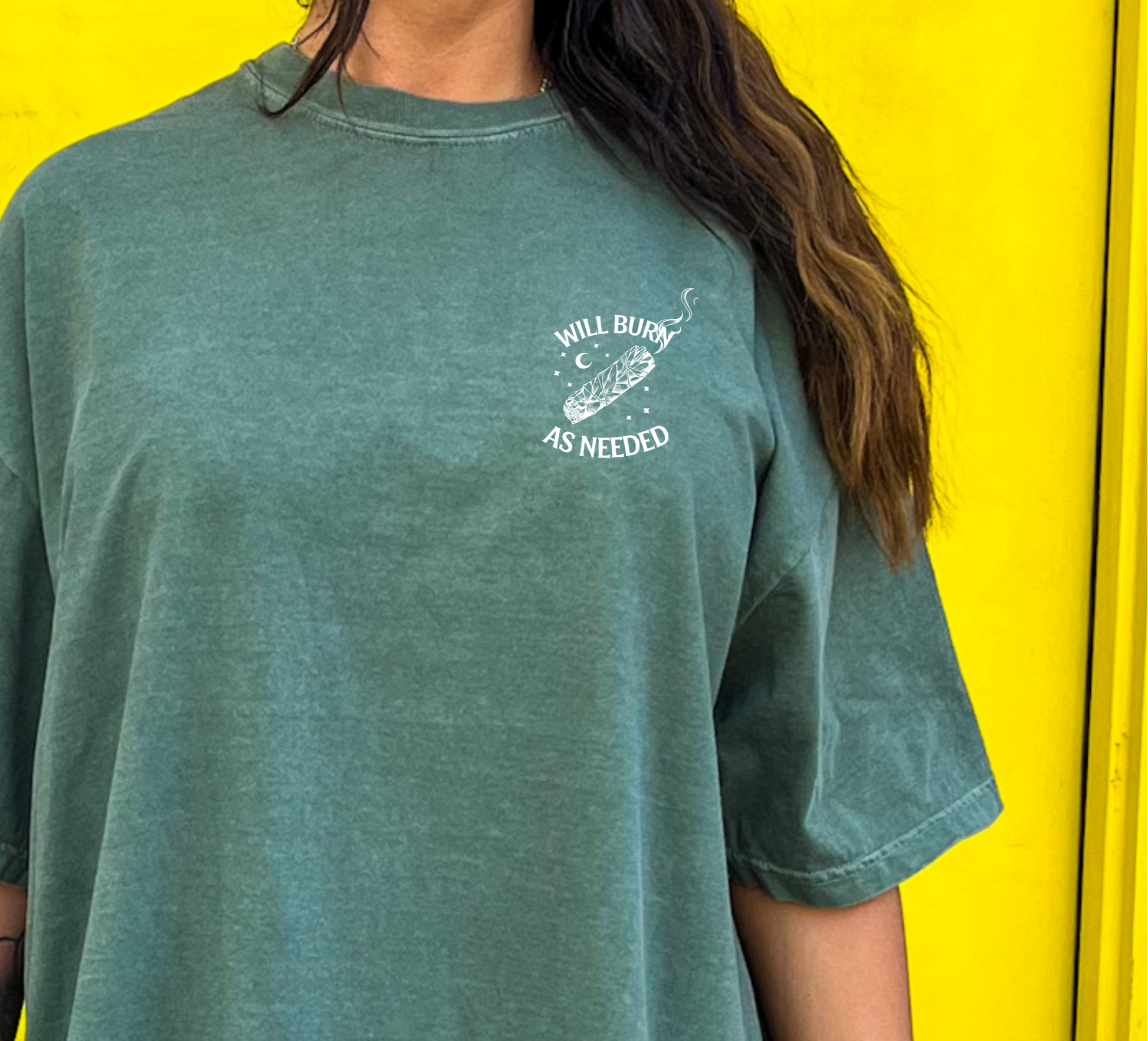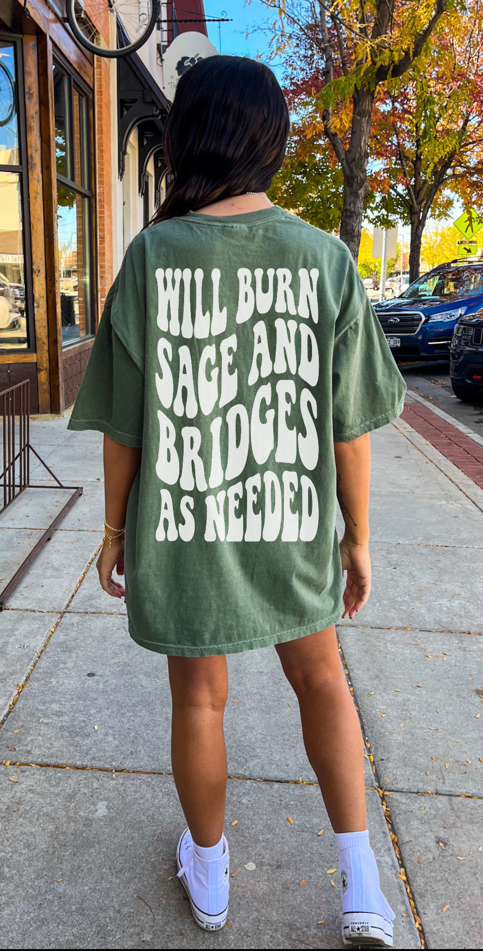 "Will burn sage and bridges" screen printed to last on a hemp Comfort Color tee. Tee is a unisex fit. Size up 1-2 sizes for an oversized look.